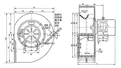 B4-72型離心通風機又稱防爆離心通風機(以“B”表示)作易燃揮發性氣體的通風換氣用,輸送氣體的溫度不得超過80度。